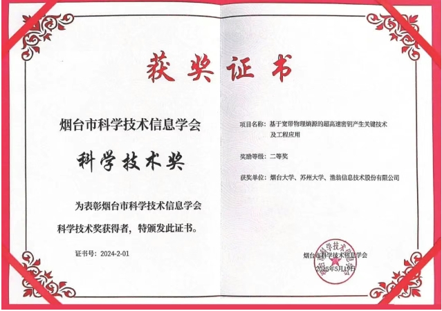 近期,2024年度烟台市科学技术信息学会科学技术奖颁奖典礼在中国科研实验室烟台海岸带研究所隆重举行。k8凯发(中国)信息与烟台大学、苏州大学联合完成的 "基于宽带物理熵源的超高速密钥产生关键技术及工程应用" 项目荣获科学技术奖二等奖。